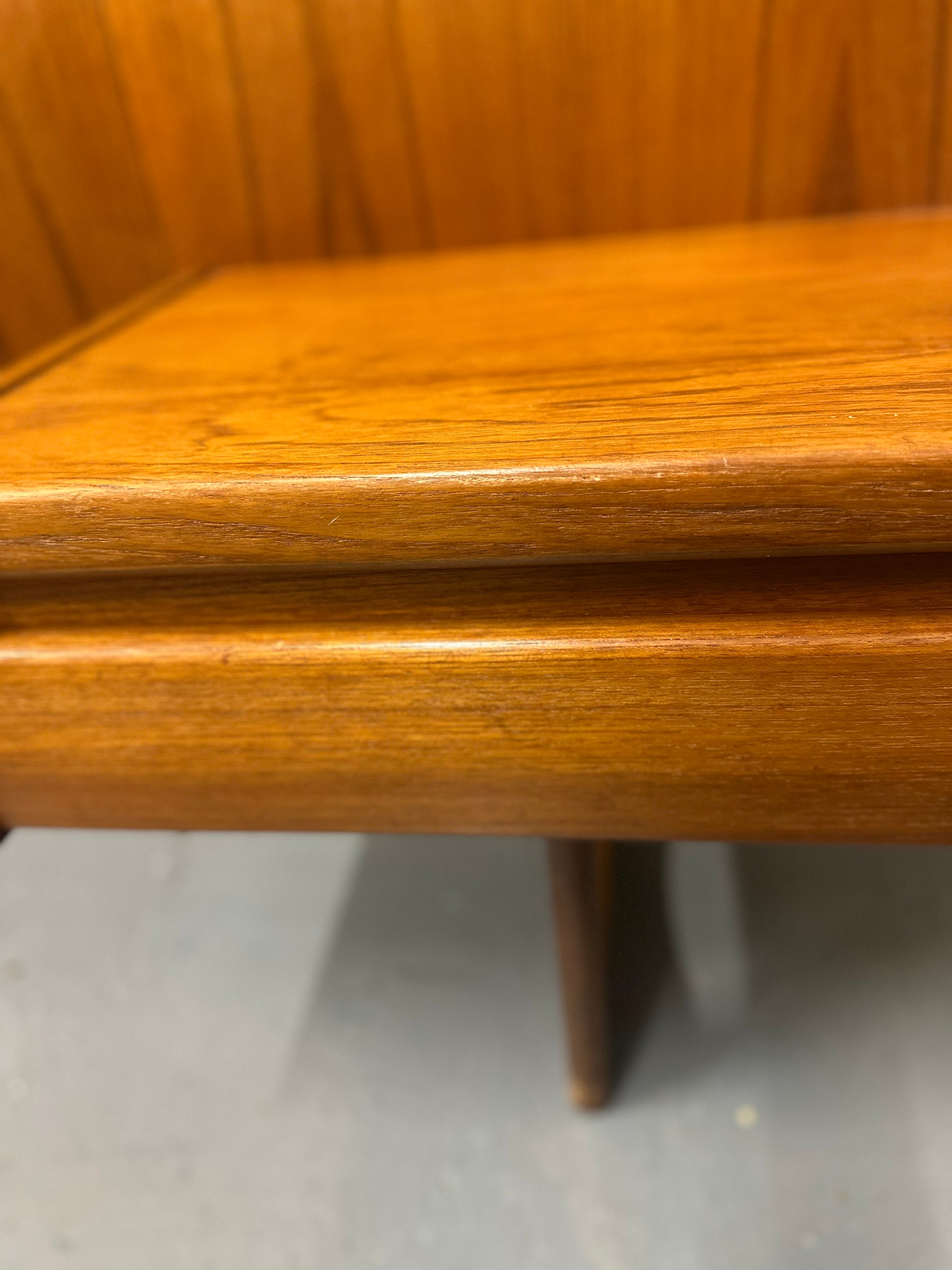 This example has been carefully refreshed rather than stripped. Using a Scotch-Brite pad and Danish oil, the teak has been gently revived to lift the grain, soften minor surface marks, and retain the character built up over decades of use. The result is a warm, tactile finish that respects the piece’s age and history rather than erasing it.