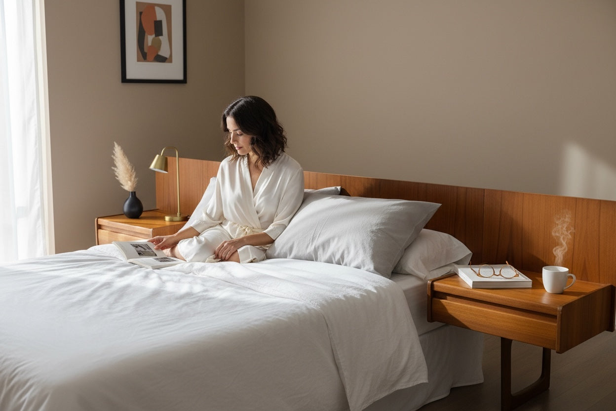Executed in teak, the design combines a full-width headboard with integrated floating bedside cabinets, creating a strong horizontal line across the bed wall. The proportions are calm and deliberate, with softly radiused edges and clean planes that reflect the influence of Danish furniture of the period.